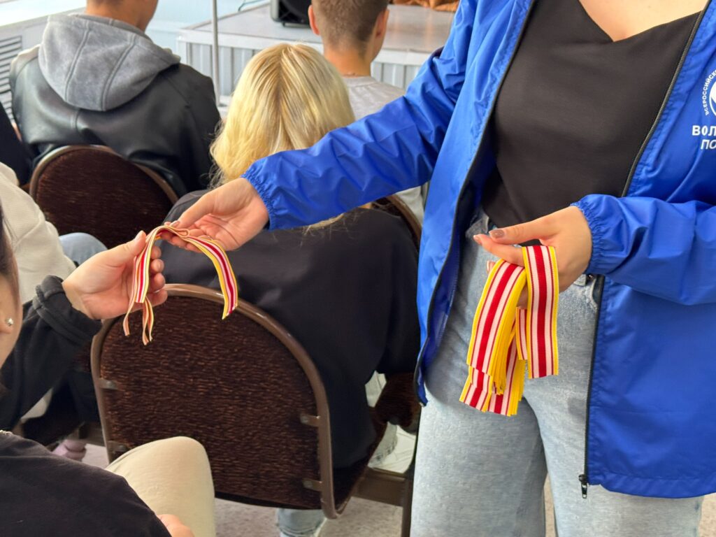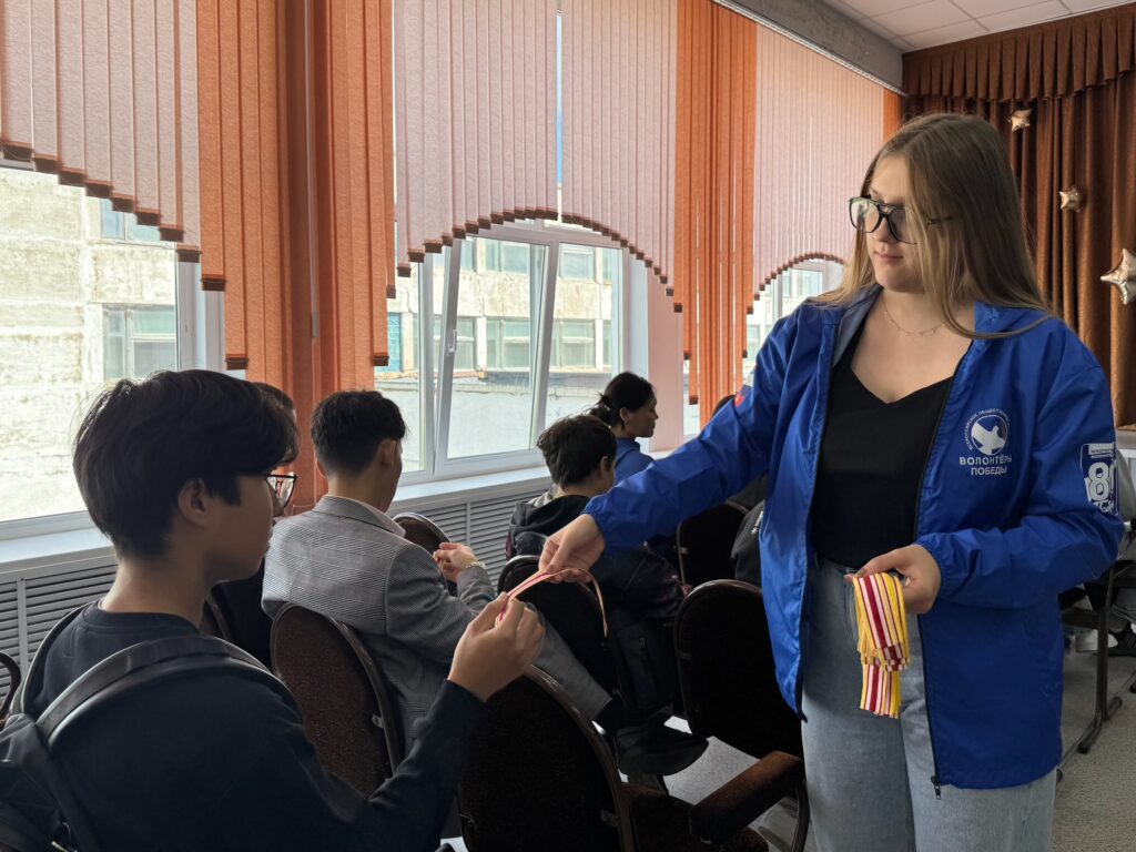 Активист Всероссийского общественного движения «Волонтёры Победы» в рамках данной акции вручила студентам муаровые ленты и информационные листовки, рассказывающие о подвиге Дальневосточного региона в Великой Отечественной войне.