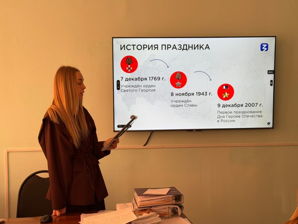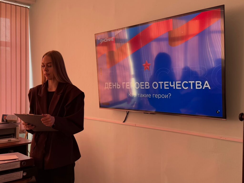 В этот значимый день Советник директора по воспитанию провела лекцию для студентов на тему «Кто такие герои?». Мероприятие было организовано и проведено федеральным государственным бюджетным учреждением «Российский детско-юношеский центр» совместно с Общероссийской общественно-государственной просветительской организацией «Российское общество Знание» в рамках Дня Героев Отечества.