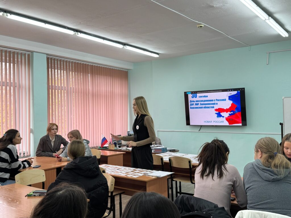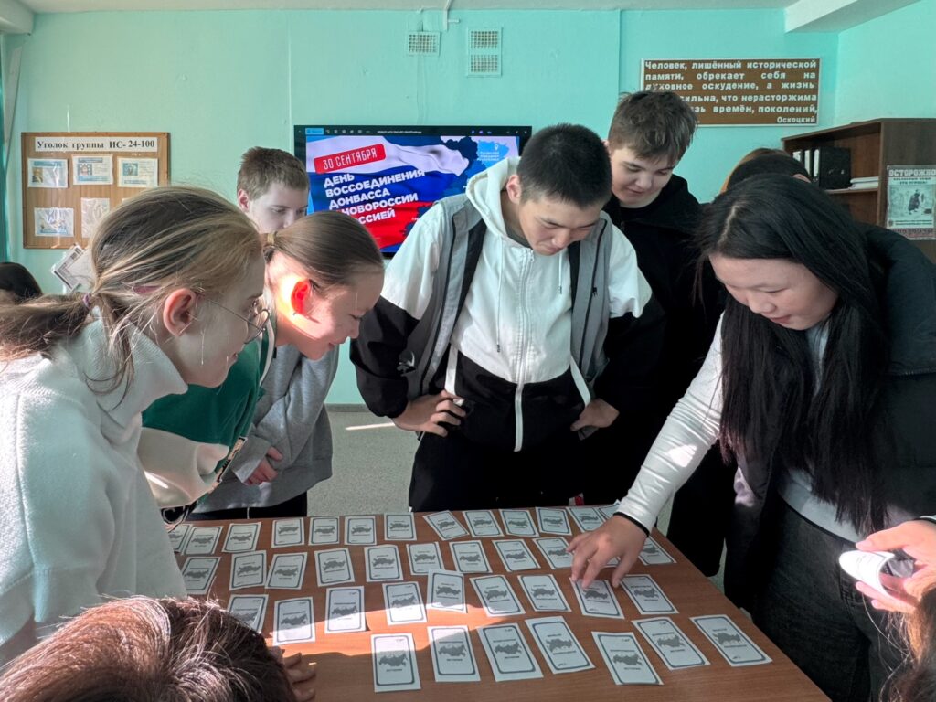 30 сентября в России отмечается День воссоединения Донецкой Народной Республики, Луганской Народной Республики, Запорожской области и Херсонской области с Российской Федерацией, в этот день советник директора по воспитанию организовала увлекательную настольную игру «Возвращение истории» для студентов Ачинского колледжа транспорта и сельского хозяйства.