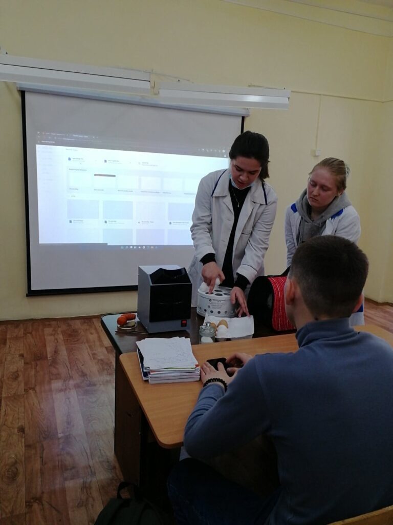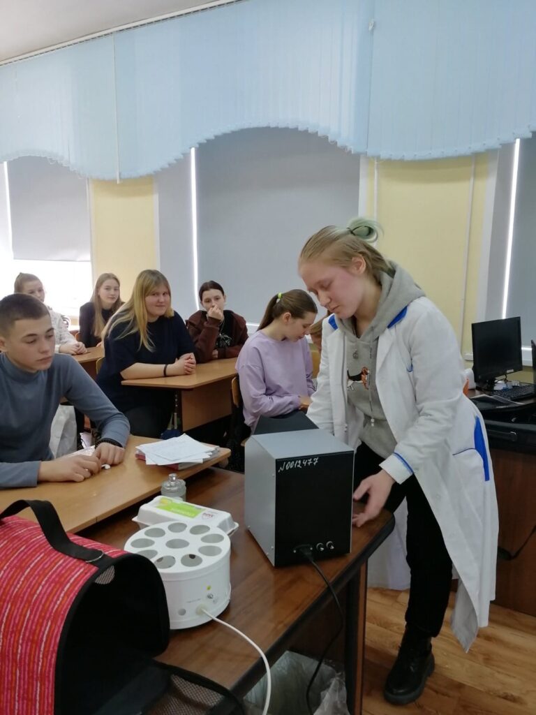 Волонтёры Малышева Кристина и Кривенко Юлия показали учащимся специфику работы на оборудовании ветеринарного назначения и определении качества яиц и других продуктов питания на овоскопе и люминоскопе.