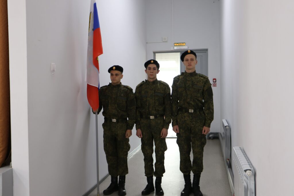 Торжественная линейка началась с церемонии выноса государственного флага Российской Федерации. Почетное право вносить флаг представилось участникам военно-патриотических игр и соревнований: Ускову Вадиму, Аббасову Аламдару и Кацапову Артёму.