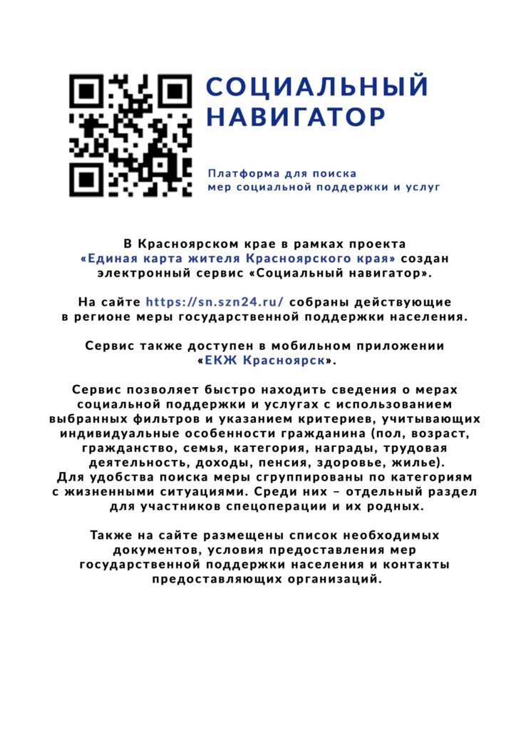 Социальный навигатор – платформа для поиска мер социальной поддержки и услугВ Красноярском крае в рамках проекта «Единая карта жителя Красноярского края» создан электронный сервис «Социальный навигатор». На сайте sn.szn24.ru/ собраны действующие в регионе меры государственной поддержки населения. Сервис доступен также Читать дальше …